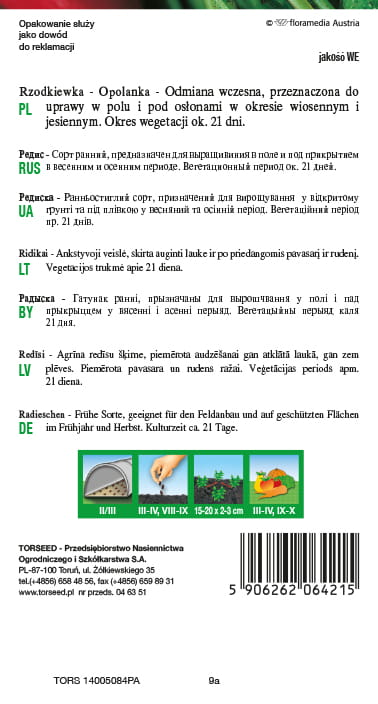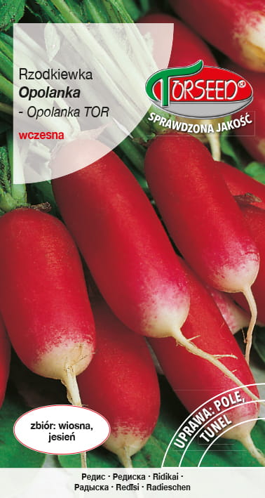 Rzodkiewka Opolanka. Odmiana wczesna, o zgrubieniu cylindrycznym, przydatna głównie do uprawy pod osłonami. Charakteryzuje się smacznym miąższem o małej skłonności do parcenia. Ze względu na bardzo duży plon z jednostki powierzchni oraz walory smakowe i cienką ładnie wybarwioną skórkę cieszy się popularnością na rynku. Okres wegetacji około 21 dni. Gramatura – 10 gram.