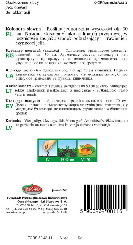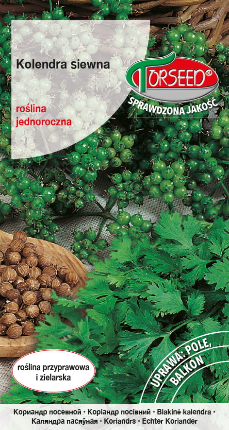 Roślina jednoroczna. Częścią jadalną są owoce o korzennym zapachu. Idealna do tłustych mięs i pasztetów oraz do marynowania ogórków, buraków, grzybów oraz wypieku pierników. Poprawia trawienie, ma działanie przeciwskurczowe i przeciwbakteryjne. KOLENDRA SIEWNA preferuje stanowisko suche, dobrze nasłonecznione.Uprawa z siewu wprost do gruntu.