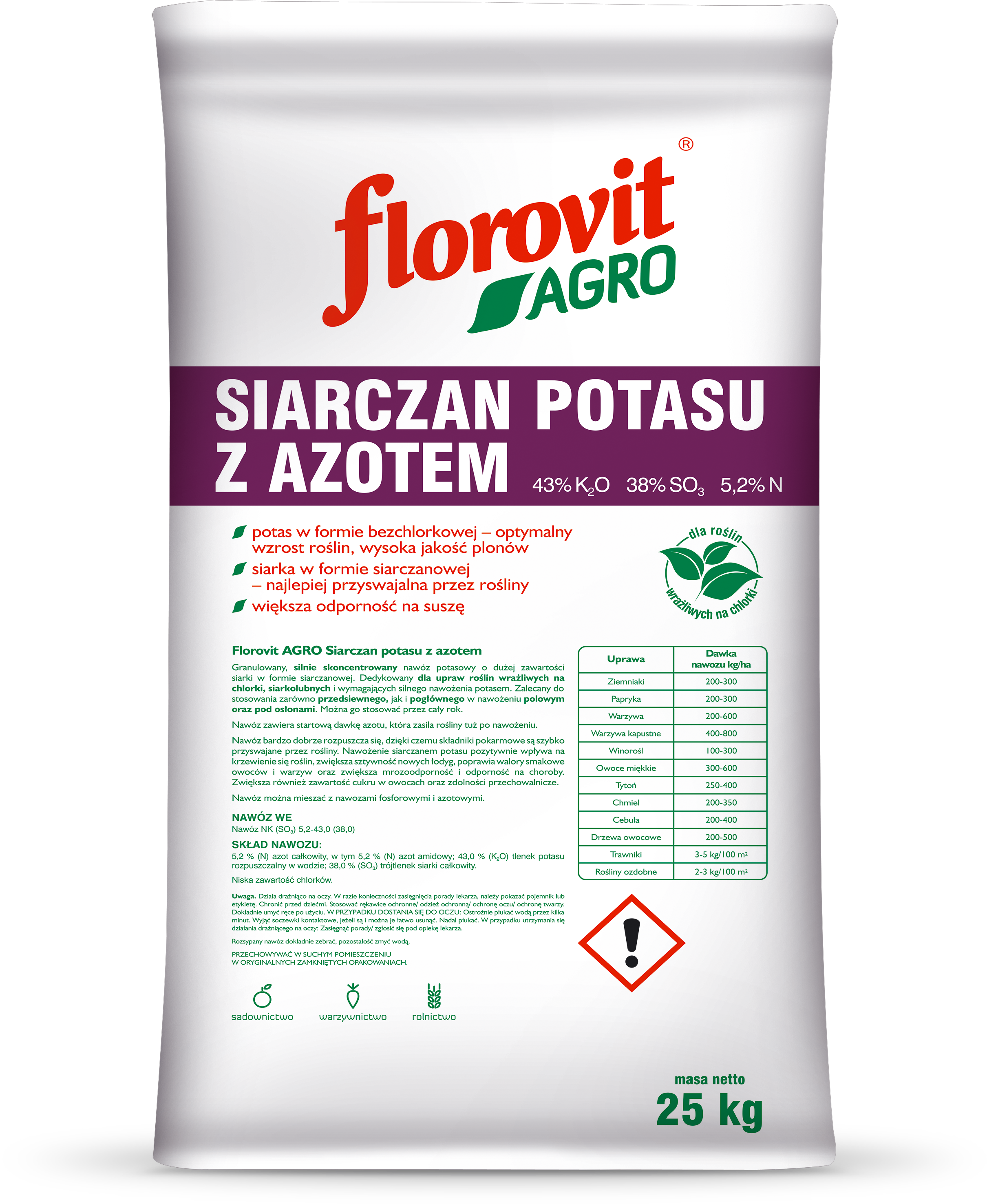 Granulowany, silnie skoncentrowany nawóz potasowy o dużej zawartości siarki w formie siarczanowej. Dedykowany dla upraw roślin wrażliwych na chlorki, siarkolubnych i wymagających silnego nawożenia potasem. Zalecany do stosowania zarówno przedsiewnego, jak i pogłównego w nawożeniu polowym oraz pod osłonami. Można go stosować przez cały rok. Nawóz zawiera startową dawkę azotu, która zasila rośliny tuż po nawożeniu. Nawóz bardzo dobrze rozpuszcza się, dzięki czemu składniki pokarmowe są szybko przyswajane przez rośliny.